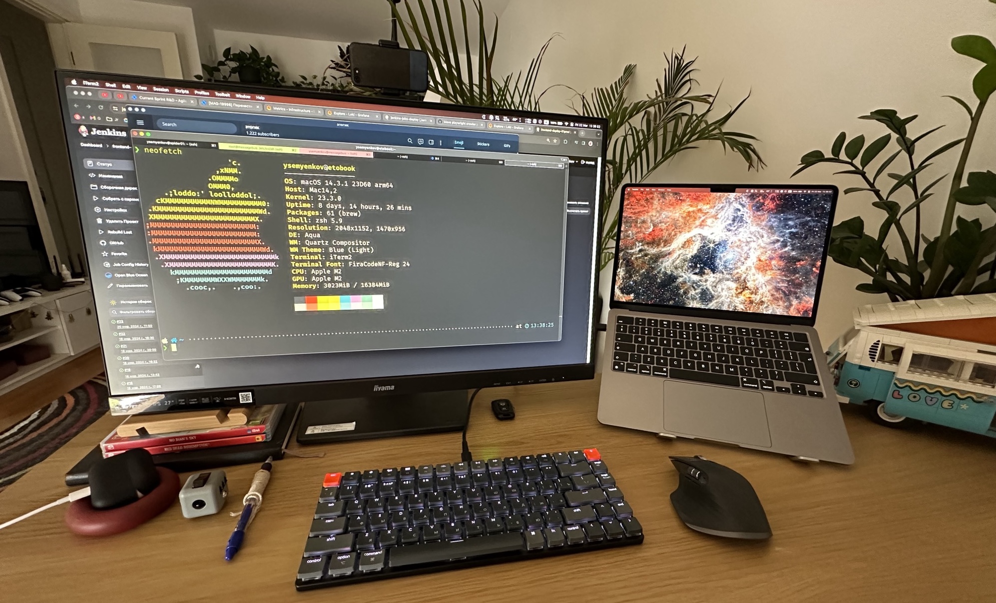 Моя текущая рабочая «машинка» — это MacBook Air M2, 13", 16GB. Отличная машинка, максимально шустрая по сравнению с Интеловской версией. Совершенно не греется и не шумит (да, в ней нет вентиляторов), но и не троттлит по перегреву. Заряда спокойно хватает на полный рабочий день.