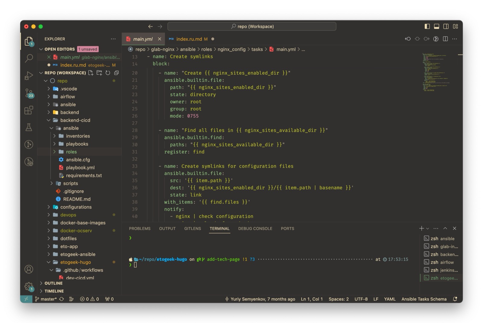 gruvbox, иконки -Material Icon Theme - Основные дополнения: GitLens, Nginx Config, Duplicate Action, Remote SSH, Codex